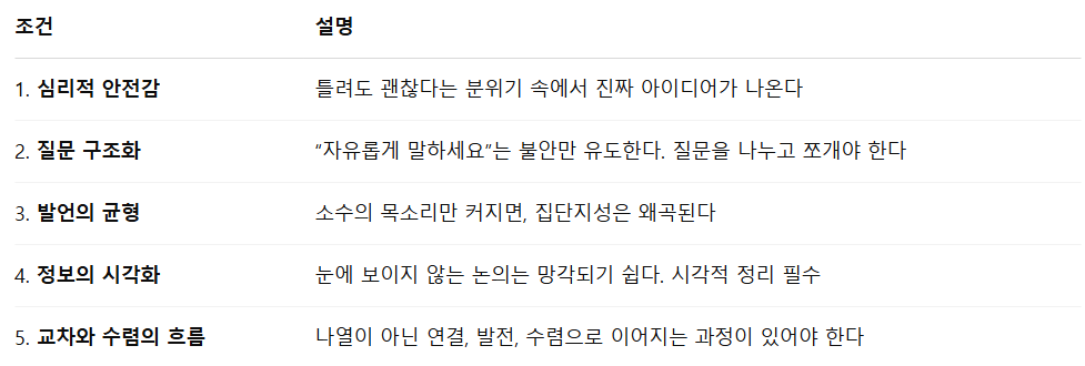 이 조건들은 퍼실리테이션 과정에서 유기적으로 통합되어야 합니다.
